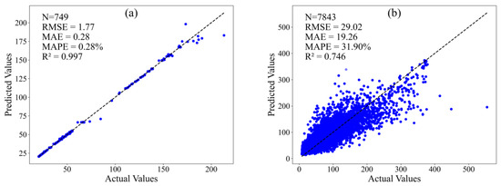 In this research, to evaluate the influence of six variables on PM2.5 levels, we developed two machine learning models utilizing the random forest (RF) algorithm, focusing on temporal and spatial aspects. The data were split into the following two distinct groups: 70% for training purposes and 30% for testing. The effectiveness of the models was assessed using the widely accepted method of 10-fold cross-validation [25]. Through Bayesian optimization, the study identified the optimal parameters for the temporal model as follows: max_depth at 28, min_samples_split at 3, and n_estimators at 10. For the spatial model, the optimal parameters were determined as follows: max_depth at 41, min_samples_split at 15, and n_estimators at 96. Figure 6 presents the performance indicators of the temporal and spatial RF regression models, including the sample size (N), coefficient of determination (R2), root mean square error (RMSE), mean absolute percentage error (MAPE), and mean absolute error (MAE). Both models demonstrated excellent performance (R2 = 0.997 for the temporal model and R2 = 0.746 for the spatial model). Therefore, the SHAP method was applied to quantify the impact of each variable on PM2.5 levels within each model.