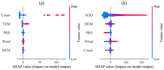 Notably, the importance rankings of the six variables varied considerably between the temporal and spatial models. In the temporal model, the number of fire-point counts emerged as the predominant contributor to PM2.5 levels, with an importance value of 0.72 (Figure 7a), highlighting it as the critical factor influencing PM2.5 variations during straw-burning periods. TEM followed as the second significant factor, with an importance value of 0.19. Both the fire-point count and TEM had a positive impact on PM2.5 levels (Figure 8a), indicating that an increase in fire counts accompanied by rising temperatures contributed to the worsening of PM2.5 conditions. Other elements, including PRE, Wind, and DEM, had a smaller spread of SHAP values clustered around zero, indicating a lesser and more variable impact on PM2.5 levels.