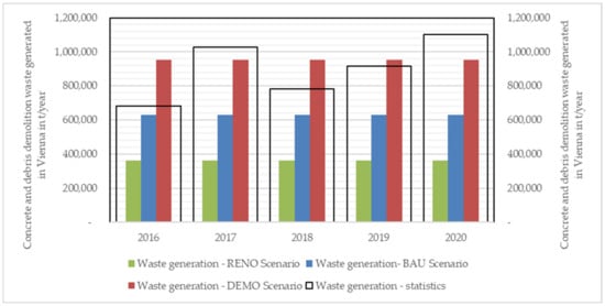 Generation of concrete and debris (bricks, mortar, etc.) demolition waste from buildings generated in Vienna based on statistics from the City of Vienna [32] if compared to the amounts modelled in the scenarios by Lederer et al. [17].