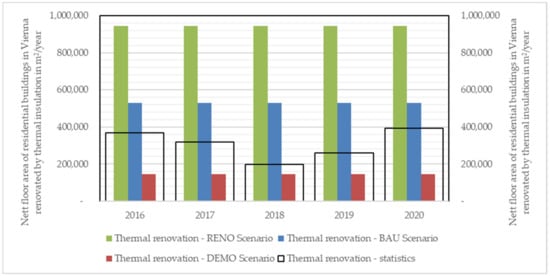 Based on this statistical data for the years 2016–2020, Vienna more likely develops its building stock somewhere in between the aforementioned BAU-scenario and the DEMO-scenario from Lederer et al. [17]. For instance, the amount of waste generated from buildings has increased since 2016, as shown in Figure 1, while the NFA of buildings being renovated by thermal insulation remains virtually constant, as shown in Figure 2. For this study, it was thus assumed that Vienna would start in the year 2021, with the assumptions as defined in the DEMO-scenario of Lederer et al. [17]. Furthermore, it was assumed that the buildings stock of the city is gradually managed as in the BAU-scenario, which means a reduction in the number of buildings demolished but an increase in the number of buildings thermally renovated, if compared to the DEMO-scenario.