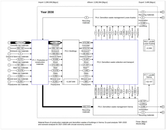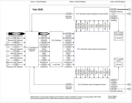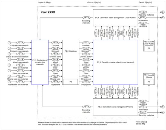 For modelling the material flows of construction materials and demolition waste in the updated building model of Vienna, material flow analysis (MFA) after Brunner and Rechberger [41] was used. Two types of MFA models were calculated. The first does not consider an enhanced local circular economy in the building sector but assumes that demolition waste from Vienna are either exported to the neighbouring federal state of Lower Austria or recycled to other sectors than building construction. The second is an enhanced local circular economy scenario that assumes the maximum treatment of demolition waste in Vienna to produce secondary raw materials to be used in Vienna’s building sector.