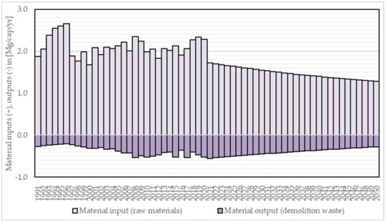 The updated material input and output model is shown in Figure 4 and in the Supplementary File spreadsheet (Table “S11 Results per-captia”). Even though it was assumed that the scenario 2021–2050 follows the DEMO-scenario from Lederer et al. [17], the material input after 2021 is smaller than in the preceding years. The reason for this is that it was assumed that the NFA per person remains constant, while it was expanded in recent decades. This influences the material inputs. In other studies, particularly Heeren and Hellweg for Switzerland and Soonsawad et al. for Canberras, decreasing material inputs in the building stock were also predicted [55,56]. The reasons for this are manifold, including population decrease in the case of Switzerland, but also a saturation of the building stock in both cases. On the output side, the amount of waste from the demolition of buildings starts with a high value, which is reduced until 2050 to a level that was experienced in the year 2001. This is in contrast to the assumptions from Heeren and Hellweg, who assumed higher material outputs in the future, caused by the refurbishment of buildings [55].
