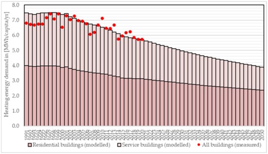 Figure 5 shows the updated HED model of Vienna for 1991–2050. The data are also displayed in the Supplementary File spreadsheet (Table “S11 Results per-capita” and “S9 Results_heating-energy”). The result first shows the good agreement between the modelled and the measured data from Gollner [57] for the years for which data were available (1991–2020). Furthermore, the model shows the decline in the per capita HED since the year 2001. This is clearly an achievement not only of new low-energy buildings substituting old high-energy consuming buildings, but also of thermal renovation of existing buildings [13,31]. With respect to future HED, the results are in line with studies from the UK and Finland, even though in these studies, the temperature increase due to global warming has a much higher impact than in this study, where this factor was not considered [58,59]. Furthermore, the reduction in HED in Vienna as modelled in this study is stronger than in the cities investigated by Harris et al. [60]. However, the study of Harris et al. modelled the total energy demand of cities, and not only the HED. What is remarkable in this study for Vienna is the comparatively high HED of service buildings, which are only 13 m2 NFA/capita in Vienna if compared to 41 m2 NFA/capita for residential buildings. This means that the potential to save energy for the HED in Vienna is larger for service buildings, despite their smaller relevance in terms of the HED.