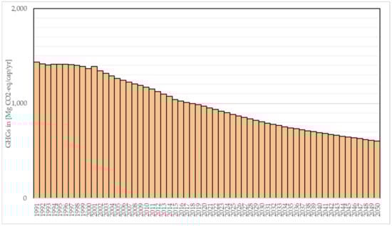 The was calculated for the year 2019, which is the base year, and for the years 2021–2050 on a scenario basis. The results are indicated for the years with a reduction target, namely 2030 (−30%), 2040 (−40%), and 2050 (−50% of the per capita if compared to the year 2019). The unit is Mg/capita/year.