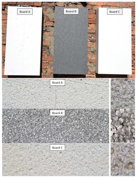 Board C—Board C consisted of expanded polystyrene without the addition of graphite (white polystyrene) with enhanced technical parameters. Samples were numbered as follows: