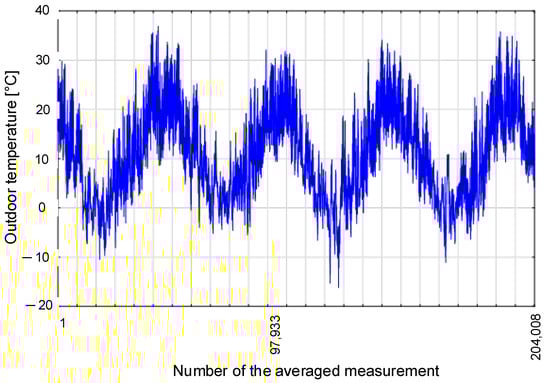 The results of climate measurements are presented graphically. The research was carried out as continuous measurements using the local meteorological station VantagePro2 Davis Instruments. The outside air temperature was measured at a height of 200 cm above ground level. The measurement started at 0:00 on 1 September, 2018, and ended on 13 October, 2022, at 7:00. The findings were recorded every 10 min as a ten-minute average. A total of 204,008 measurement results were recorded. During the first full measurement period (from August to July of the following year), the minimum external temperature te min = −10.8 °C and the highest te max = +36.9 °C were recorded. The following year was characterized by the lowest temperature amplitude. In winter, the minimum temperature was te min = −6.9 °C, and the highest was te max = +32.7 °C. The third measurement year was characterized by the lowest temperature during the investigation, which was te min = −16.2 °C. The highest temperature was te max = +33.8 °C. In the last year, no extreme temperature values were recorded either in summer or winter. Figure 2 shows the results of the outdoor air temperature measurement.