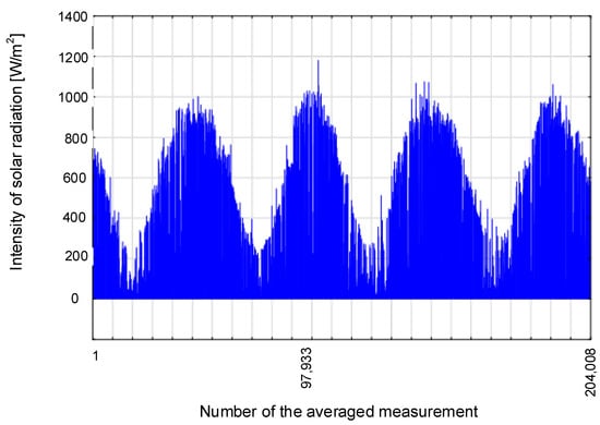 Measurements of the intensity of solar radiation were also performed in the horizontal plane (Figure 3). In the case of the impact of solar radiation intensity, in the first year of the study, the highest number of hours with an intensity ranging from 600 to 1000 W/m2 was recorded. The fewest number of days with the intensity exceeding 600 W/m2 was recorded in the second year, despite the occurrence of its local maximum values throughout the entire measurement period.