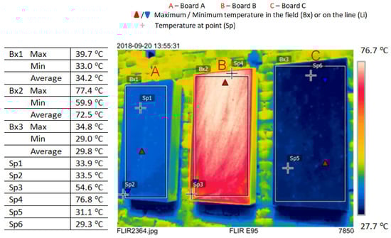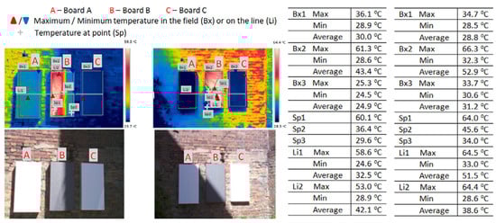 In situ research was based mainly on thermal imaging measurements. Measurement elements in the form of measurement points (Sp), measurement lines (Li), and rectangular areas (Bx) were applied to the thermal images of the analyzed objects. An exemplary thermogram of the measurements is shown in Figure 4. The highest measured temperature on the thermal insulation surface exceeded 80 °C for board B. Much lower maximum temperatures were recorded for board A, slightly exceeding 40 °C. Board C was characterized by a surface temperature lower than max. 6 °K compared with board A. The temperature distribution within the individual polystyrene boards was, of course, dependent on the speed of the acting wind. This was especially visible on the surface of board B (Figure 4). The impact of the wind caused dynamic temperature changes that were recorded in a thermal imaging camera and presented on a thermogram in the form of the so-called heat plume. In the case of plates A and C, local point growths in temperature were observed in the thermograms. They were related to small inclusions of single graphite polystyrene granulates and, in the case of board A, to the penetration of the graphite polystyrene layer under partially melted white polystyrene balls (a layer of small thickness). However, such situations occurred relatively rarely (Figure 1). The expanded polystyrene boards were subjected to the non-uniform influence of solar radiation because of the proximity of the surrounding objects. This resulted in the presence of shading at certain times of the day (Figure 5). This resulted in temperature differences within the graphite polystyrene board exceeding 30 °K during periods of exposure to high-intensity solar radiation. This uneven heating of the polystyrene boards may consequently lead to their partial deformation.
