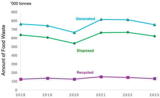 Figure 1. Total food waste generated, disposed of and recycled in Singapore (2018–2023).