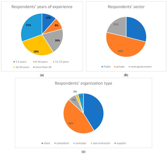 (a): Respondents’ years of experience; (b) respondents’ sector; (c) respondents’ type of organization.