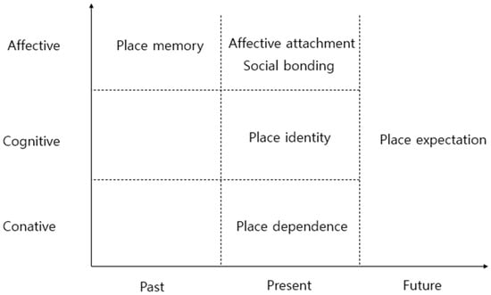 The dimensionality and scope of place attachment can vary depending on which aspects are focused on. Place attachment can be interpreted by focusing on the person, the social relations, and/or the surrounding environment []. Additionally, while attachment itself strongly connotes emotional bonding, place attachment has been conceptualized more widely, incorporating cognitive, affective, and conative dimensions []. For instance, as shown in Figure 1, Chen and Dwyer [] incorporated all realms of place attachment, including the cognitive, affective, and conative components. Raymond et al. [] followed Trentelman’s [] analysis of the research traditions that can be classified into three: (1) socio-cultural views; (2) biophysical views that focus on a place as an environmental setting; and (3) a combination of the two. From this perspective, biophysical views emphasize place identity and place dependence. Raymond et al. [] conceptualized place identity and place dependence as the realm that captures an individual’s attachment to a place. Many others have acknowledged place identity as closely related to place attachment [].
