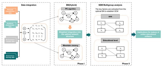 Figure 1). In the first stage, we considered gender, age, and ethnicity as students’ personal characteristics, and school level, education level, length of time spent in school, and learning-incentive money as their academic characteristics. The number of learning incentives on the online education platform is the number of incentives students received on that platform. We used school type, school nature, school economic geographic location, and school regional geographic location as academic environment variables. We adopted a hybrid BN-based approach to identify causal links between online self-directed learning motivation and learner characteristics (student personal characteristics, academic characteristics, and academic environment variables) among university students. In the second stage, we extracted online self-directed learning motivation as the core key variable and built a multigroup SEM with high causal arc strength as a premise from which important causal relationships were mined. In the third stage, we used multigroup SEM for group difference analysis to determine whether significant differences existed between the groups.
