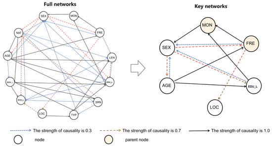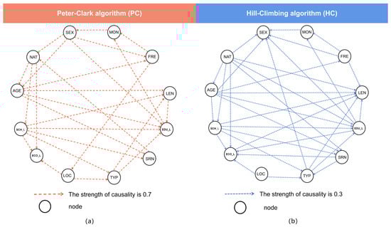39]. The hybrid algorithm first obtains the graph structure according to the Peter-Clark (PC) algorithm and then uses the Hill-Climbing (HC) algorithm to connect the learned structures of each subgraph, and weighted corrections are made to the two graph structures to obtain the optimal BN structure.