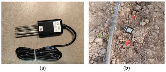 To facilitate the farmer’s interaction with the technology, a single piece of equipment integrating multiple sensors was selected. This approach precluded the need for the farmer to implement four distinct sensors. The sensor selected is IP68 ABS Soil NPK Sensor Taidacent, B08MXXSP59, Guangzhou, China [23], High Precision Soil Nutrient Intelligent Fertilizer Detector Tester Meter NPK Sensor. Its specifications are as follows. Measuring Range: 0–1999 mg/kg—Working Humidity: 5 to 95% (relative humidity), no condensation—Measurement Accuracy: ±2%F. s—Resolution: 1 mg/kg (mg/L)—Working Temperature: 5 to 45° C—Power Supply: 12 V–24 V DC. Figure 1a presents a detailed close-up view of the sensor. The sensor was installed appropriately within the field of the small family farm in the southern region of Zagreb, Croatia, to prevent interaction with other plants or their data (Figure 1b).