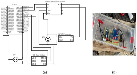 The sensor system was developed using the ESP32 microcontroller (SIMAC Electronics HANDEL GmbH, Neukirchen-Vluyn, Germany), which serves as the central processing unit controlling the system. It incorporates the NPK 5-pin sensor to measure soil parameters such as potassium, phosphorus, humidity, temperature, and pH levels. The system is equipped with Wi-Fi connectivity for real-time data transmission and includes local data logging onto an SD card to ensure data backup in case of Wi-Fi instability. Figure 2 presents a schematic diagram of the system circuit (Figure 2a) and the actual system installed on the farm (Figure 2b).