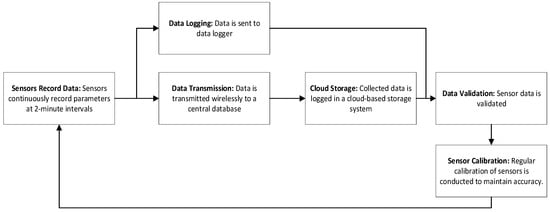 The data collection process was designed to capture comprehensive environmental and soil parameter data across the study site. Figure 3 illustrates the flow diagram of the steps involved in this process. Sensors continuously recorded data at set intervals (every 2 min) to capture enough variations and overall trends. The data were transmitted wirelessly to a central database using IoT communication protocols. Also, data logger was used as a backup plan to prevent data loss. The collected data were logged in a cloud-based storage system, allowing for remote access and ensuring data integrity. Regular calibration of sensors was conducted to maintain accuracy. Validation of sensor data was performed by comparing sensor readings with expected values. The analysis presented in this article is based on over twenty-seven thousand collected data points. Table A1 in the Appendix A exhibits a small sample from the data collected from the sensor.