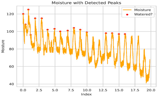 For the automated detection of watering events based on humidity data, we leveraged the functionality provided by the latest version of the SciPy library (version 1.13.0) in Python (version 3.10). Specifically, we employed the find peaks function, which offers robust peak detection capabilities. This method utilizes various parameters, such as peak prominence and peak width, to identify local maxima in the dataset corresponding to significant changes or peaks in humidity levels as shown in Figure 4. By carefully tuning these parameters to suit our dataset and experimental conditions, we were able to accurately detect peaks indicative of watering events. This automated approach not only facilitated the timely detection of watering occurrences but also eliminated the need for manual intervention, thereby streamlining the data analysis process and enhancing its efficiency.