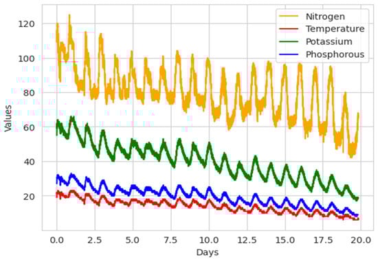 Utilizing the 5-in-1 sensor and the data logger, the data on N, P, K, pH, and temperature were collected over several days. Figure 5 below presents a snapshot of the data plotting. As can be seen from the figure, the N, P, and K values decreased as the plant grew. This outcome aligns with expectations and is corroborated by the reviewed literature, which confirms that plants consume nutrients during growth.