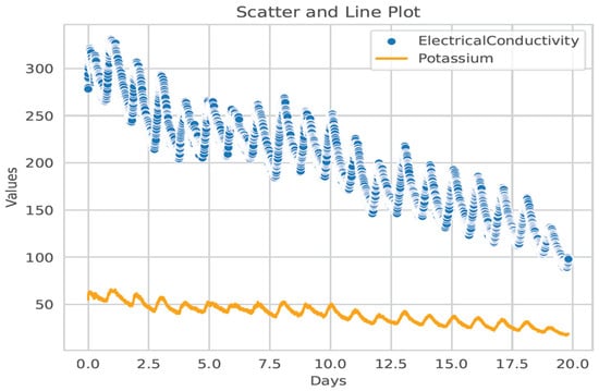 Our analysis revealed consistent patterns between EC measurements and potassium levels within the soil. Given the known association between potassium ions and EC [11,14], this observation suggests the potential for approximating potassium levels based on electrical conductivity readings, or vice versa, Figure 6.