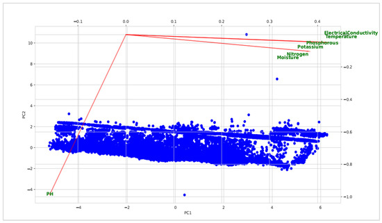 The PCA biplot analysis unveiled distinct patterns among the various parameters under investigation. Notably, the pH value exhibited a unique and independent pattern, primarily associated with PC2. This separation from the other parameters suggests that pH variations are driven by different underlying factors compared to the remaining parameters. In contrast, the parameters including moisture, nitrogen, potassium, phosphorus, temperature, and electrical conductivity displayed similar variation patterns in the data, predominantly characterized by PC1, Figure 7.