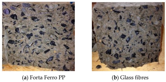 Furthermore, examining fracture surfaces indicated that steel fibres have excellent dispersion and minimise tensile fractures (Figure 16a). On the other hand, the ReoShore 45 PP fibres shown in Figure 16b exhibit a horizontal alignment and intersecting tensile cracking. Still, their dispersion appears to be poor, as confirmed by inspection. Visual examination revealed an even distribution of Forta Ferro PP and glass fibres throughout the concrete.