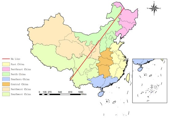 Map of China’s seven geographical divisions. Note: This map was drawn based on the standard map of the National Administration of Surveying, Mapping, and Geoinformation, approval number: GS(2020)4619, with no modifications to the base map. The “Hu Line” (Heihe–Tengchong Line) is an imaginary line that divides China into two regions with contrasting population densities: the eastern region, which is densely populated, and the western region, which is sparsely populated [].