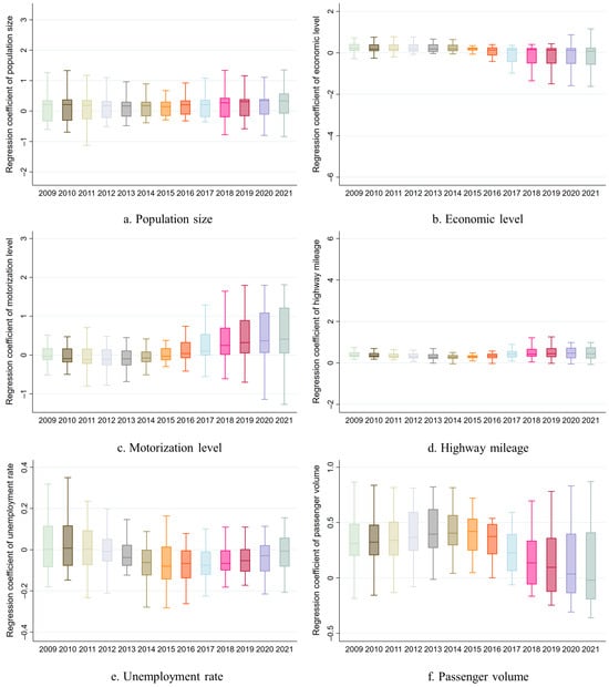 (2) From 2009 to 2021, the regression coefficients of economic level were both positive and negative, experiencing the process of positive to negative and decreasing year by year, from 0.165 in 2009 to −0.169 in 2021 specifically, of which there was a positive correlation from 2009 to 2015 and a negative correlation from 2015 onwards, with obvious differences. Additionally, there was considerable variability in dispersion across the years from 2009 to 2021, confirming the temporal heterogeneity of economic level. The improvement of economic level is often associated with an increase in people’s education level and social quality, leading to greater adherence to traffic rules by drivers. Moreover, governments typically allocate more resources to improve transportation infrastructure, which may contribute to reducing the occurrence of traffic accidents.