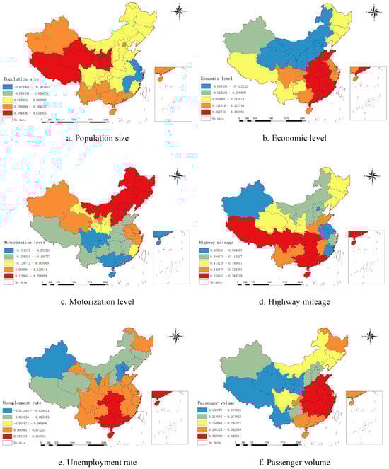 According to the natural breakpoint grading principle in ArcGIS 10.2, the average regression coefficients of each province from 2009 to 2021 were calculated. The spatial distribution map of the influencing factors is plotted in Figure 3.