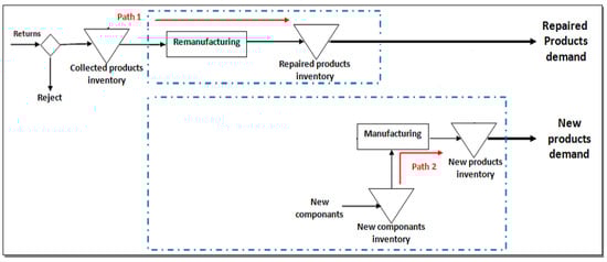 This is a reference configuration as presented in Figure 1, and it is composed of two independent lines: Path 1 and Path 2. In this configuration, all collected products are refurbished (after selection), none of them are disassembled, and newly manufactured items use only purchased new parts. Path 1 makes refurbished products satisfy the demand for refurbished products. Path 2 independently receives new parts and manufactures new items. This reference configuration does not consider the integration of refurbishing into the production of new items. It is supposed to be the least attractive configuration from the economic and ecological points of view. To reduce the number of models (model for path 1 and model for path 2), we formulated this configuration using a single model called Model MAR using a mixed integer linear program (MILP) described below.