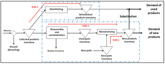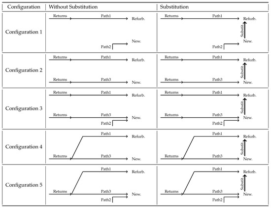 - In all configurations, the production facility receives returned products. Some of the returns will be discarded and sent directly to an independent recycling process (not shown here). The accepted items can be refurbished (Path 1 in all configurations) and used to satisfy the demand for second-hand products or disassembled (Path 3 in Configurations 2–5).