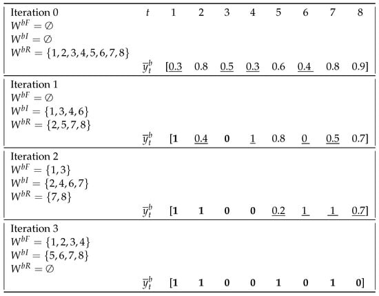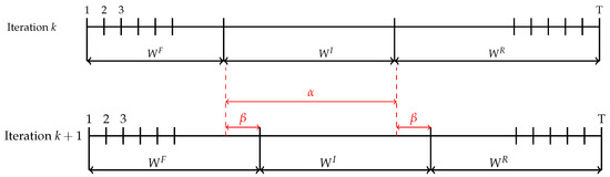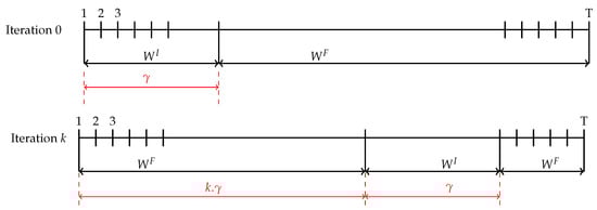 To provide a good first solution, the TRF heuristic is used as the first phase of TRF-FO. The procedure is illustrated in Figure 4. Its main strategy is to split the planning period into several windows of time periods. The setup variables in the first window, which we refer to as , are fixed at the preceding optimal values obtained by solving a MILP sub-problem in the earlier iterations. The setup variables are forced to be binary in the second window, . The setup variables in the last window are relaxed. The window length is determined by the parameters and , where , determines the window length of , and denotes the sliding step of . Then, at each iteration, , , and are updated as indicated in Figure 4. In the first iteration and in the first periods (where ), the setup variables in a MILP sub-problem (called the relax-and-fix lot-sizing model), are forced to be binary, and all other setup variables are relaxed. In the second iteration, setup variables from periods where to are taken to be their optimal recorded values, which have been obtained by solving the MILP sub-problem in the preceding iteration. The variables from periods to are then forced to be binary and relaxed from periods to T. In general, from iteration k to iteration , the following periods are added to the window . Window is shifted forward by periods, and the first periods are eliminated from window .