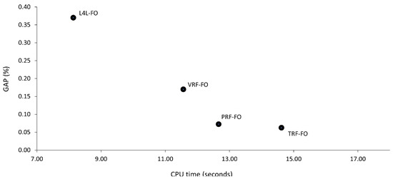 For the largest instances with (Table 7), the best results were obtained using the PRF-FO heuristic in 75% of the cases (24 out of 32 in Table 7). The other 25% best results were obtained using the TRF-FO heuristic. Table 7 shows that these two heuristics (PRF-FO and TRF-FO) are the only ones that are not dominated. The decision maker can choose between a fast heuristic with relatively good performance (TRF-FO) and a slightly slower heuristic with the best performance (PRF-FO).