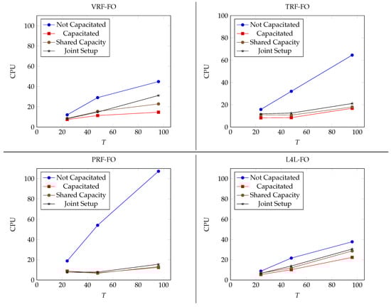 The heuristic TRF-FO provided the best results on all instances with (Table 6), except in Variant 3 (shared capacity and joint setups) when demand variability was low or when setup costs were small. In the former case, the VRF-FO heuristic performs much better than PRF-FO, TRF-FO, and L4L-FO. Nevertheless, on average, the worst performance is that of VRF-FO with a 1.12% gap from the best known solution. This makes it dominated by L4L-FO, which is still the fastest heuristic (as in instances with ) and with a gap of 1.08%.