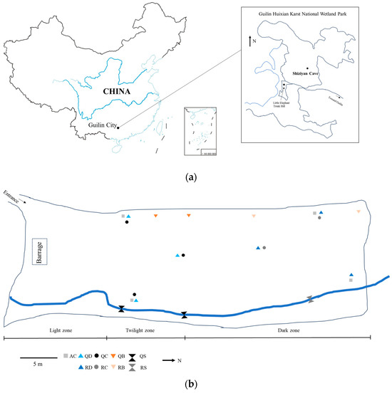 (a) Location of Shiziyan Cave. (b) Schematic diagram of the horizontal profile of the ecosystem of Shiziyan Cave and the sampling points inside the cave.