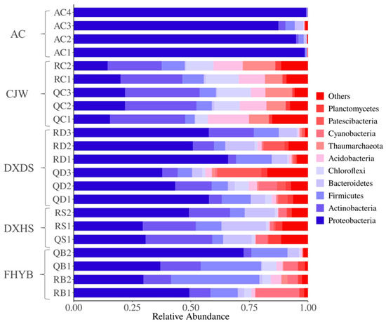 By analyzing the sequencing of samples from five habitats, a total of 12,167 OTUs from 22 samples belonging to 56 phyla and 402 orders were obtained. The microbial distribution differed among habitats at the phylum level (Figure 2). In the sediment samples (CJW), the dominant phyla were Actinomycetota (28.77%), Pseudomonadota (18.73%), and Bacillota (11.76%), and Actinomycetota had the highest percentage in CJW compared to the other four habitats. In the weathered rock wall samples (FHYB), the dominant phyla were Pseudomonadota (47.13%), Bacillota (22.67%), Actinomycetota (10.33%), and Cyanobacteria (7.33%). In the cave air samples (AC), the dominant phylum was Pseudomonadota (95.00%). Among the liquid samples, in the cave drip samples (DXDS), the dominant phyla were Pseudomonadota (52.20%), Actinomycetota (9.88%), Bacillota (9.37%), and Bacteroidota (6.67%); in the cave’s underground river water samples (DXHS), the dominant phyla were Pseudomonadota (36.44%), Actinomycetota (22.89%), Bacteroidota (14.65%), and Bacillota (7.27%). The above results indicate that microbes are more abundant, and their distribution is characterized by specificity in each habitat of the cave.