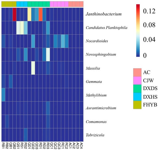 Heatmap of species abundance of carbon cycle-associated bacterial genera. The abbreviations in the figure are as follows: AC: air samples; CJW: cave sediment samples; DXDS: drip water samples; DXHS: underground river water samples; and FHYB: weathered rock wall samples.