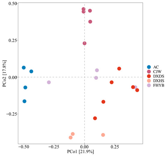 The results of the PCoA based on Bray–Curtis at the OTU level revealed the distribution of microbial communities in each habitat of the cave system (Figure 4). The results showed that some of the FHYB and DXDS samples were grouped together, indicating that their microbial community structures were similar, while the microbial community structure of the AC samples was closest to that of the FHYB samples and more distant from the DXDS, DXHS, and CJW samples, which may be due to the FHYB samples being in closer contact with the air than other habitats.