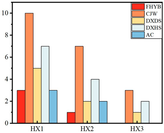 Screening of dominant carbon-sequestering strains. HX1, 2, and 3 represent the first isolation, the second isolation, and the third isolation of the T-streak method, respectively. FHYB, DXHS, DXDS, CJW, and AC represent the habitat of weathered rock wall, underground river water, cave drip, cave sediment, and cave air, respectively. The vertical coordinate indicates the number of dominant strains screened.