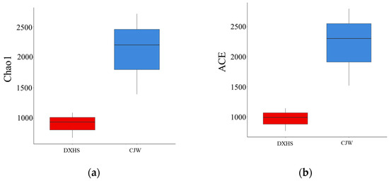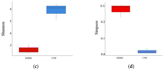 The results of one-way ANOVA showed that the abundance of cbbL genes in the cave’s underground river water (DXHS1, 2, and 3) and sediment (CJW1, 2, and 3) habitat were significantly different (p < 0.05). The abundance indices (Chao1, ACE) and diversity index (Shannon) of the carbon-sequestering microbial community containing cbbL genes were higher in CJW than those of DXHS, but the diversity index (Simpson) of DXHS was significantly higher than CJW (Figure 6).