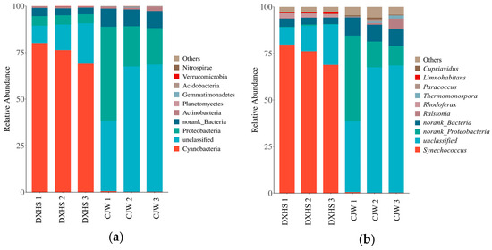 Differential comparisons of the top ten phyla (a) and genera (b) in relative abundance across habitat samples in the cave’s underground river water (DXHS1, 2, and 3) and cave sediments (CJW1, 2, and 3). DXHS 1, DXHS 2, DXHS 3, and CJW 1, CJW 2, and CJW 3 represent different sampling points in the same habitat, respectively.