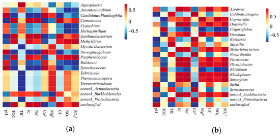 The correlation heatmap between microbes (based on genus level) and habitat factors in different habitats: (a) DXHS (cave underground river water) and (b) CJW (cave sediments).