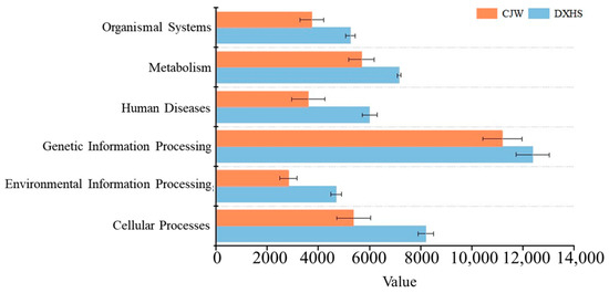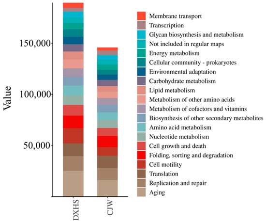 The results of the KEGG (Kyoto Encyclopedia of Genes and Genomes) pathway abundance in each sample were obtained based on PICRUSt2 analysis (Figure 9). A total of six functional modules were organized in the sample dataset, including cellular processes, genetic information processing, human diseases, environmental information processing, metabolism, and organismal systems. The most abundant functional module in both sample types was genetic information processing. A total of 46 pathways were predicted in both sample types, with the top 20 pathways relevant to the bacterial communities shown in Figure 10. Among them, the pathways were more abundant in DXHS than in CJW.