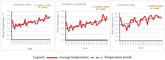 The meteorological data used for the graphs below were obtained from the National Meteorology Agency of Togo. They show the usual temperature trends in Lomé, Atakpamé, and Kara over 30 years (from 1987 to 2019). The average temperatures in Lomé fluctuate between approximately 27.1 °C and 29.1 °C. Although the temperatures are already high, there is a visible upwards trend, represented by the equation y = 0.0324x + 27.623 with R2 = 0.5913. This means that as time passes, it becomes hotter and hotter. In Atakpamé, temperatures vary between approximately 26.3 °C and 27.7 °C over the same period. There is also a trend towards higher temperatures, although the increase seems less pronounced than that in Lomé. The climate is cooler than that in Lomé. The temperatures in Kara fluctuated between approximately 26.3 °C and 28 °C over the same period. There was a slight increase overall (Figure 2).