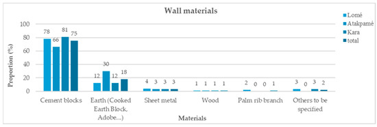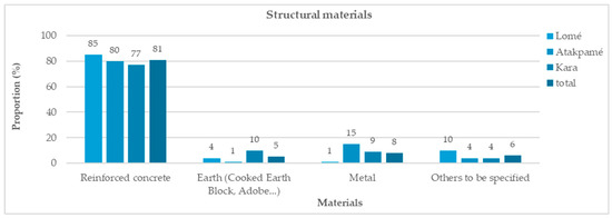 Figure 5 shows that cement, represented here by concrete, is at the core of the materials used for building structures, with a total proportion of 81%. This predominance breaks down as follows: 85% in Lomé, 80% in Atakpamé, and 77% in Kara.