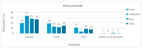 In terms of the materials used in floor homes, both inside and outside rooms (Figure 4), cement is relatively predominant (cement screed and cement paving stones), with an overall average of 54%. The other half is divided between earth (29%), tiles (16%), and other materials (1%). Atakpamé has the highest proportion of cement use, at 67%, followed by Kara at 56% and Lomé at 39%. However, Lomé has the highest proportion of earth floors (38%) and tiles (22%). In Kara, 24% of the floors are made of earth and 18% of the floors are tile, compared with 26% earth floors in Atakpamé. In Atakpamé, tiles were used less frequently, at 7%.