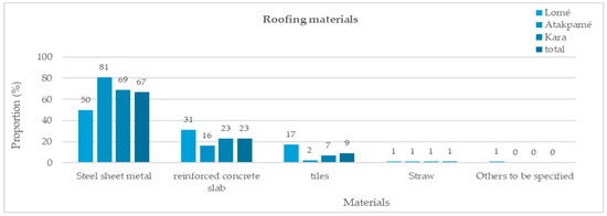 Contrary to previous observations, cement-based roofing materials (Figure 6) do not dominate. Compared with reinforced concrete slabs, which account for 23%, steel sheet metal predominates, accounting for a total of 67%. Atakpamé has the highest proportion of sheet metal roofs, 81%, and the lowest proportion of reinforced concrete slabs, 16%. It is followed by the town of Kara, with 69% for sheet metal and 23% for reinforced concrete. Lastly, Lomé has a 50% share of sheet metal and a 31% share of reinforced concrete, making it the city with the highest proportion of reinforced concrete slabs. Other roofing materials include tiles, with 17% for Lomé, 7% for Kara, and 2% for Atakpamé. Straw accounts for 1% in each city, while other materials such as tarpaulin are used exclusively in Lomé, with a proportion of 1%. We can therefore corroborate that city dwellers in Atakpamé have a less marked preference for reinforced concrete slabs and tiles, unlike in Lomé, the capital.
