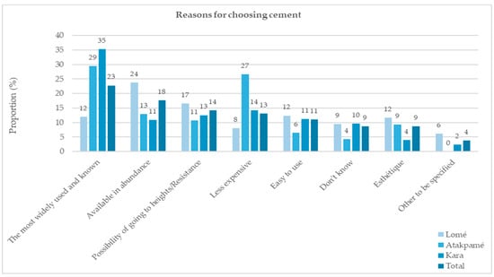 In contrast, in Atakpamé and Kara, the dominant reason is that cement is more commonly used and better known, with percentages of 35% and 18%, respectively. In Kara, the reasons are more even, with relatively close proportions.