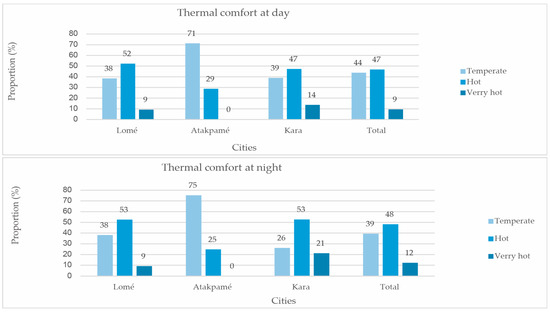 Figure 8 summarizes the thermal comfort of city dwellers in Lomé, Atakpamé, and Kara, based on population surveys. In Lomé, during the day, 52% felt warm, 38% felt comfortable, and 9% felt extreme. At night, the proportions are very similar (53%, 38%, and 9%). In Atakpamé, during the day, 71% of the respondents experienced comfortable conditions and 29% experienced heat. At night, 75% of the respondents were comfortable, while the percentage of respondents who felt heat fell to 25%. During the day in Kara, 47% were hot, 39% were comfortable, and 14% were extremely hot. At night, the proportion of people who feel warm increases slightly to 53%, while the proportion of people who feel comfortable decreases to 26%, and the proportion of people who feel extreme heat increases to 21%.