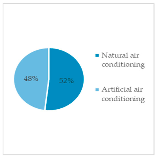 To alleviate thermal discomfort in the home (Figure 9), 48% of the population surveyed uses artificial air conditioning (air conditioners and fans), and 52% uses natural air conditioning.