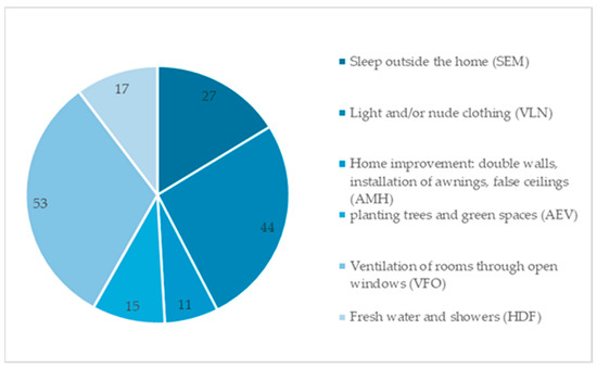Figure 10, based on data from interviews and household surveys, illustrates the proportions of different strategies adopted by residents to adapt to thermal discomfort. Of these, ventilating rooms by opening windows (VFO) is the most common (53%), followed by wearing light clothing (VLN) (44%). Other strategies are less common, such as sleeping outside the house (SEM) (27%), hydration and cool showers (HDF) (17%), planting trees and green spaces (15%), and improving the home (AMH) (11%), which includes installing false ceilings, awnings, and double walls.